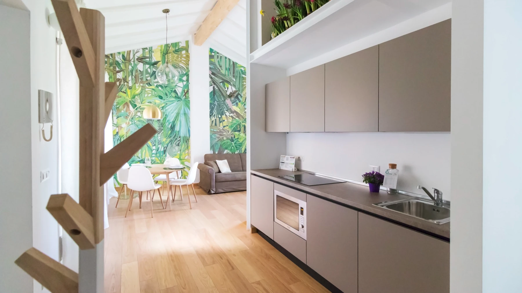 Frutto di un raffinato interior design, un elegante appartamento caratterizzato da uno stile moderno e raffinato. Gli interni sono dominati da tonalità neutre e materiali di pregio, come il marmo che impreziosisce il backsplash della cucina. L’ambiente open space unisce la cucina con un’area living accogliente, arricchita da un divano in pelle dai toni chiari e dettagli cromatici come le lampade a sospensione color rame. La luminosità naturale, amplificata da ampie finestre e tende bianche, crea un’atmosfera calda e rilassante, perfetta per la vita urbana.